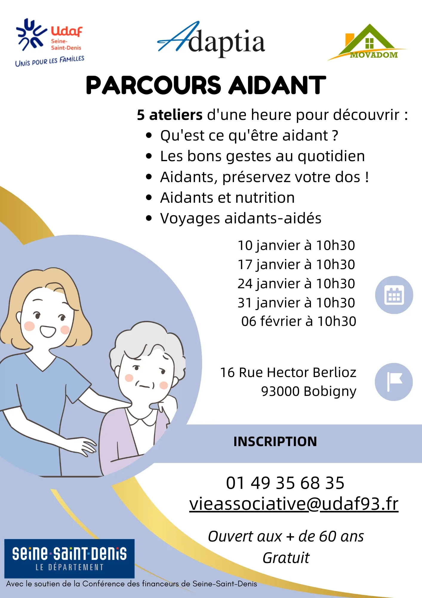En collaboration avec l’association MOVADOM, nous vous proposons 5 ateliers d’une heure afin de découvrir le parcours aidant pour les plus de 60 ans.